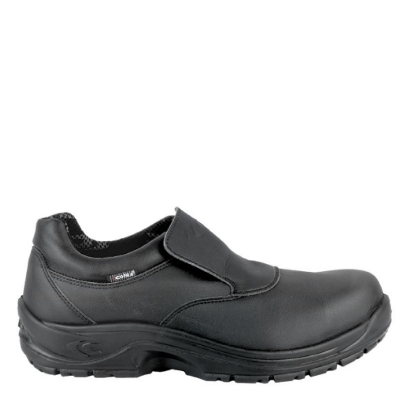 Black water repellent Lorica slip on shoe, Sany-Dry lining, antistatic, anti-shock, slipping resistant, non metallic APT Plate midsole.Plus: Footwear completely free from metal parts. Upper washable with neutral soap. Footbed AIR made of EVA and fabric, antistatic, it guarantees high stability thanks to its different thicknesses in the plantar area. Adjusting elastic-velcro fastening. Padded collar.